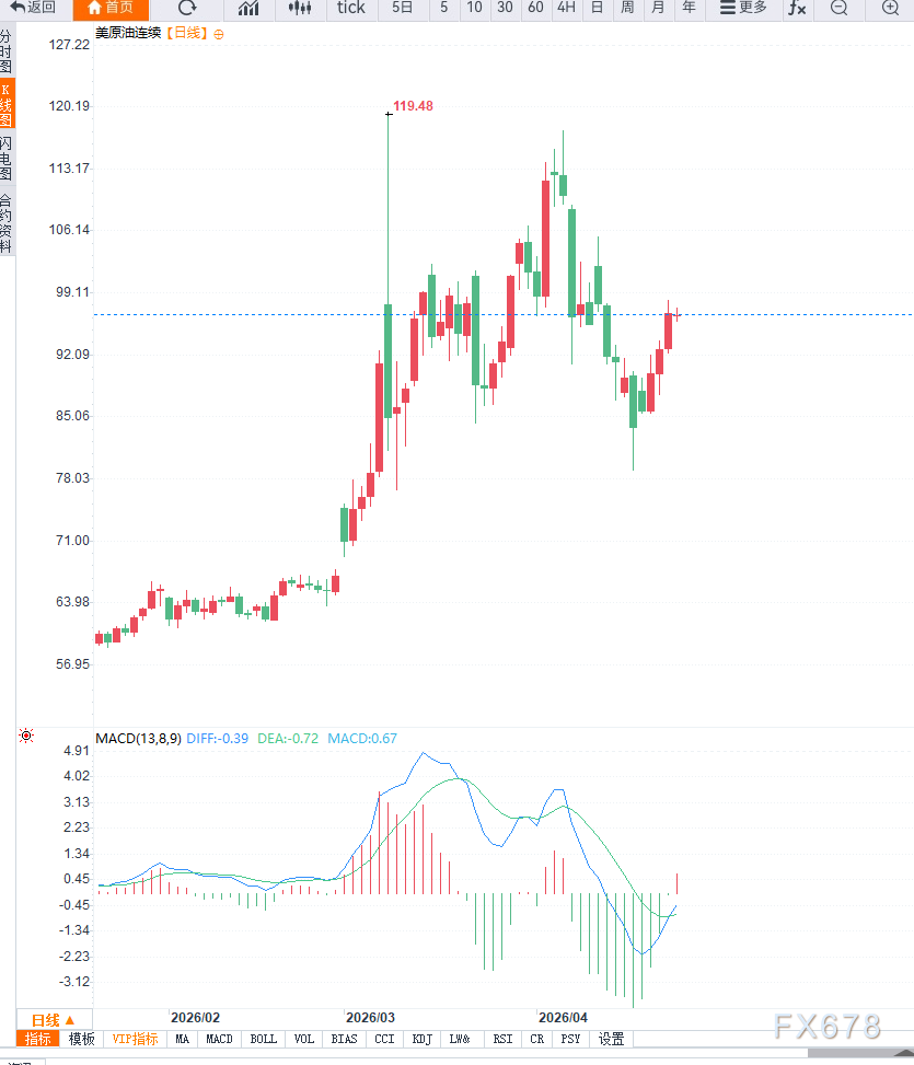 从技术面来看,日线级别上,WTI原油期货已重新站上中期上升通道,价格突破90美元后形成趋势延续结构,当前上方阻力位集中在100美元整数关口,若突破则可能打开进一步上行空间;下方关键支撑位位于92美元区域,该位置为前期突破区间。动能指标显示多头力量增强,但短期存在技术性超买迹象。4小时级别来看,价格维持高位震荡上行结构,短期支撑位在94美元附近,若回调不破该区域,趋势仍偏多;若跌破,则可能回测90美元支撑。整体来看,趋势仍由地缘风险驱动,技术面更多体现节奏调整而非方向反转。